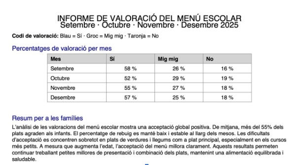 Aquest primer trimestre del curs 2025-2026, els infants han valorat el menú escolar: més del 56% dels plats agraden, el 27% els troben correctes i rebuig és baix (17%) i s'observa que l'acceptació augmenta amb l’edat.